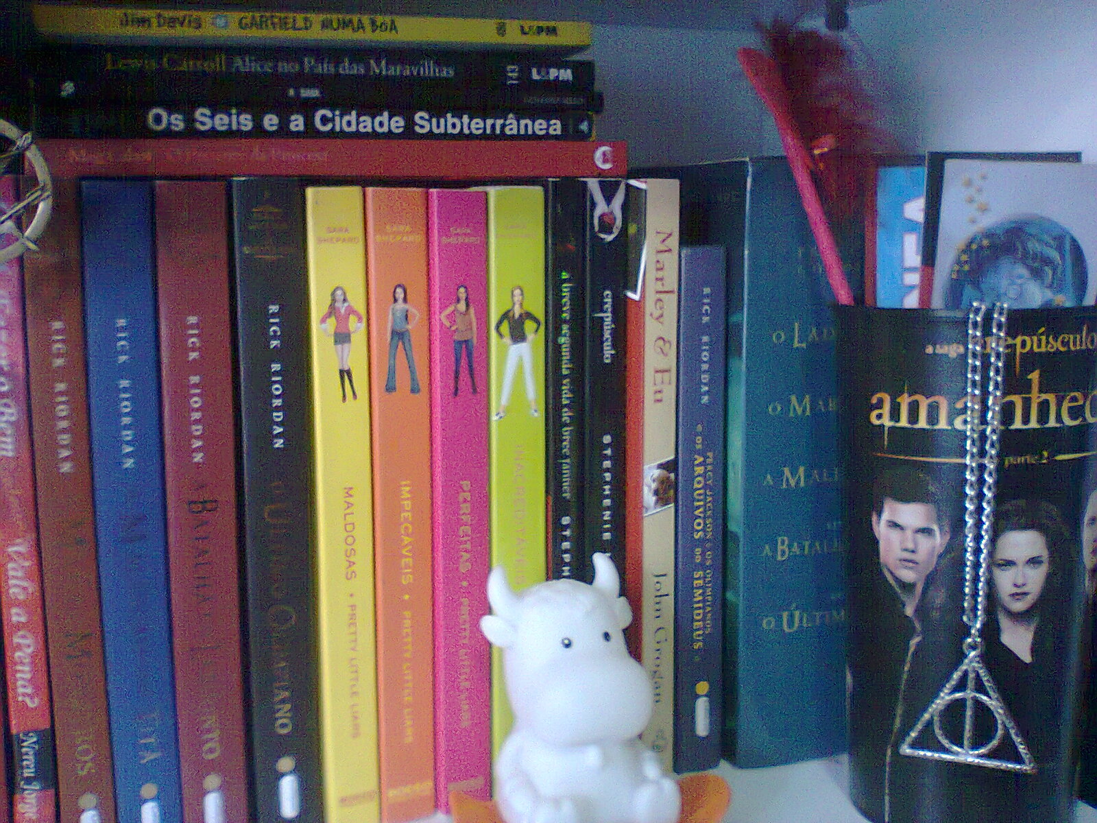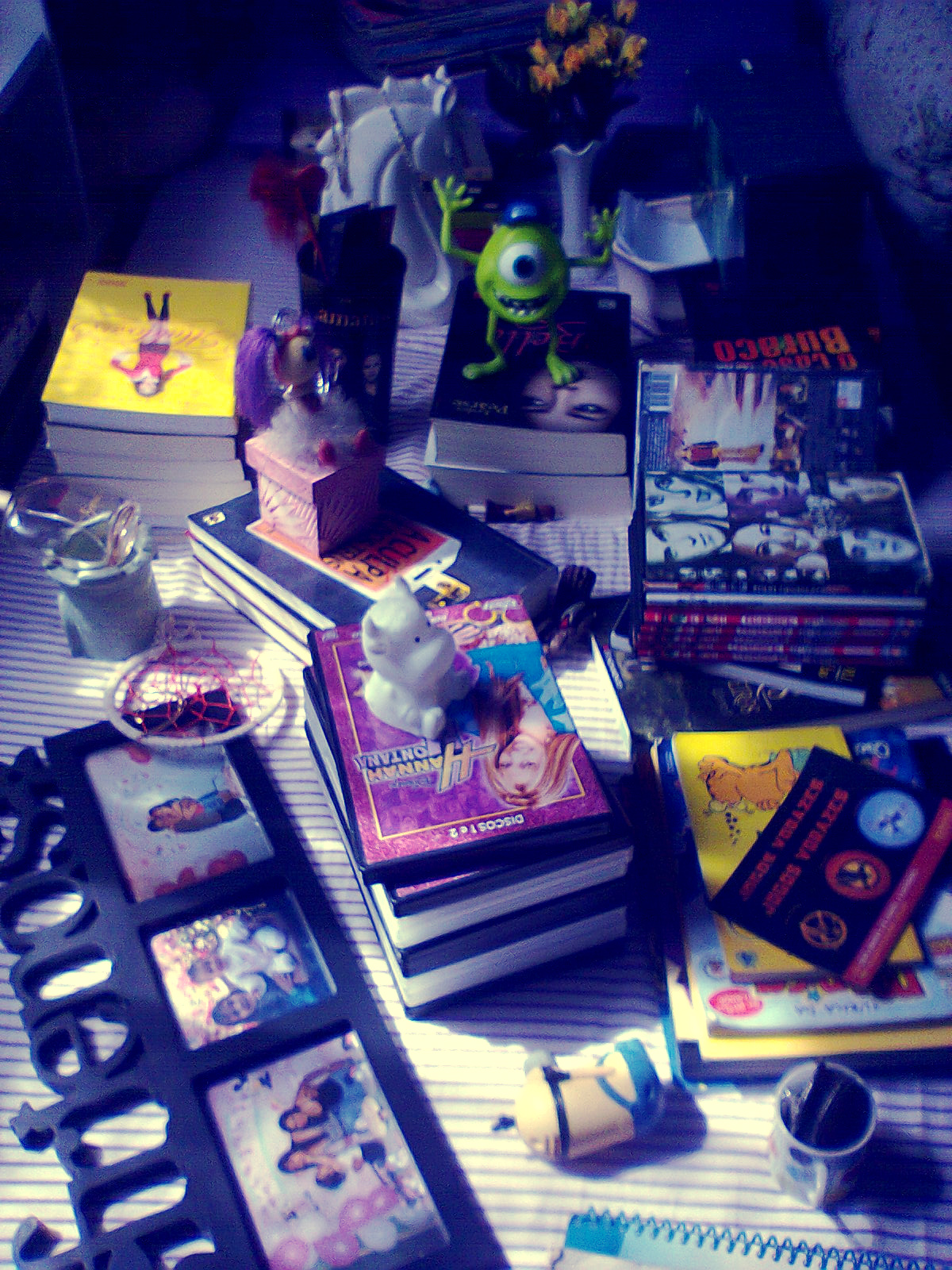 Tirei três fotos com o meu celular hoje, duas da unica prateleira completa de livros, e outra com toda minha bagunça da estante pronta pra ser organizada haha