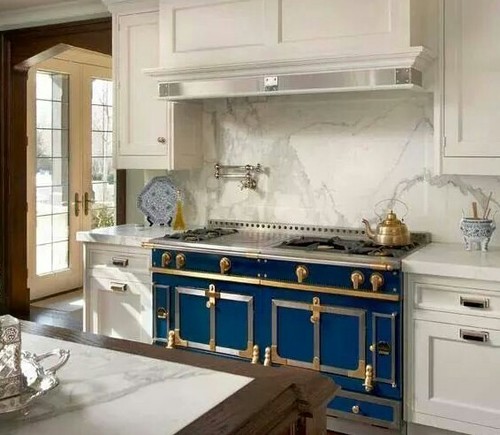 8. eu particularmente adorei essa cozinha mais simples, em um estilo mais antigo, glamouroso, mas sem exageros, a predominância do branco, azul e dourado me fez morrer de amores ♥