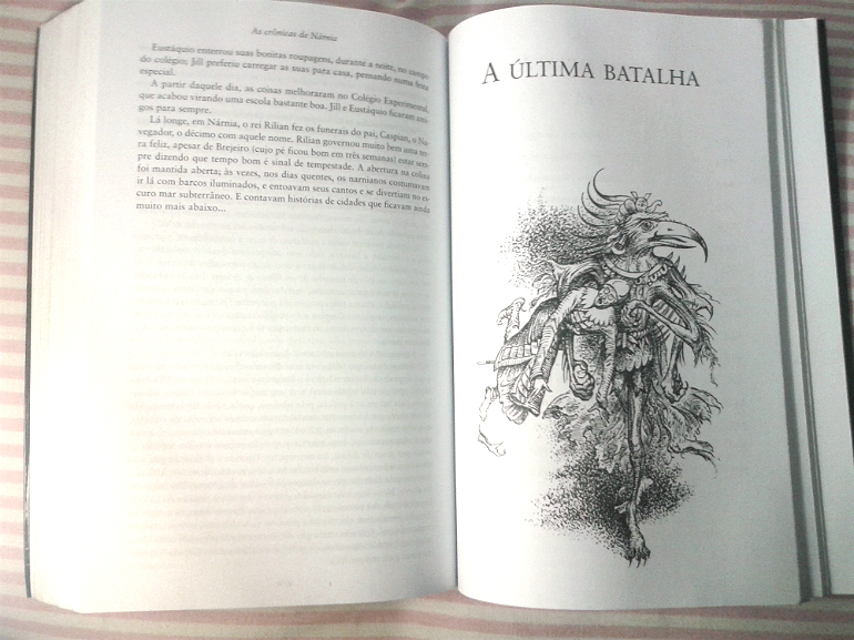 Esse é “finalmente” o fim de Nárnia. O que me deixou triste de todos os modos possíveis. Lewis caprichou muito mais do que o normal nesse livro de encerramento, nos deixando com um ótimo fim para Nárnia, pois é, nós tivemos a oportunidade de presenciar o surgimento e o fim de Nárnia, de um jeito único e especial. E mais uma coisa que gostaria de avisa-los: se vocês sofreram, choraram, com qualquer morte/desaparecimento ocorrido em qualquer um dos livros da série, pode ir se acalmando, pois uma das coisas mais fantásticas e maravilhosas da história da literatura ocorre nesse livro, nos dando a chance de descobrir o verdadeiro País de Aslam, e a verdadeira Nárnia.
