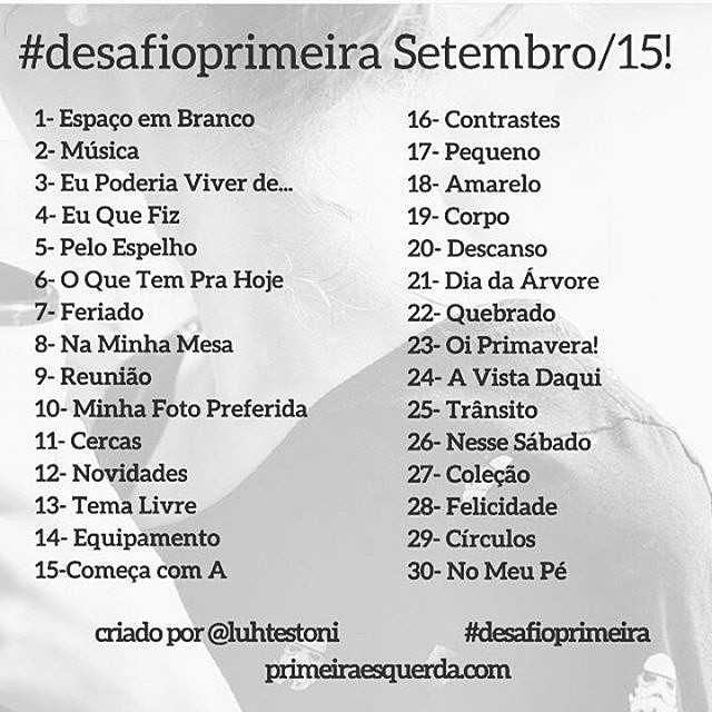 Ta rolando no instagram a algum tempo um desafio chamado #Desafioprimeira, do qual eu queria muito estar participando, mas já perdi a deixa. O desafio é bem legal, mas as regras são praticamente as mesmas que qualquer outro projeto citado aqui na lista: você terá uma lista com um tema por dia, todos os meses, e terá que postar uma foto por dia, com o tema indicado. Busquem pela #Desafioprimeira no instagram e curtam as fotos dos instagramers (escreve assim? hahah).