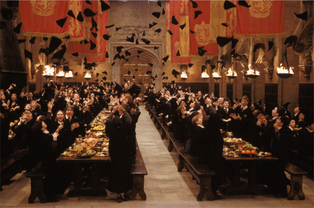 Grifinória, Sonserina, e Corvinal são todas a 50 lances de escada da comida. Estudos mostram que isso causa, nessas casas, um aumento de 27% de angústia nos bruxos.